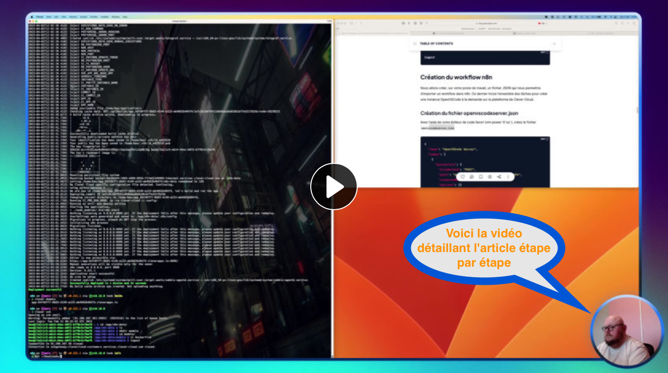 OpenVSCode Server prend en charge les extensions et les fonctionnalités principales de VSCode. Il se déploie facilement sur la plateforme de Clever Cloud, mais je souhaite pouvoir en créer et supprimer de façon automatisée. Dans cet article, je vais détailler une solution pour répondre à mes besoins en utilisant le moteur de workflow n8n. Petit rappel, n8n est un logiciel qui permet d’automatiser des tâches sous forme de workflow.