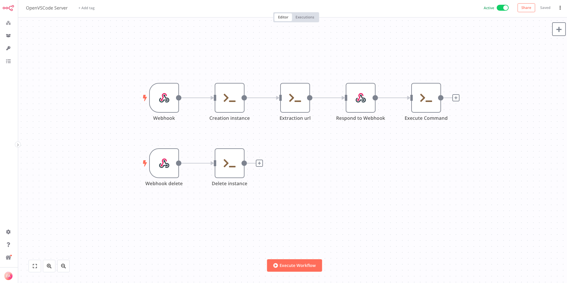 Ensuite, nous allons créer un workflow dans n8n qui se chargera de créer et de supprimer une instance OpenVSCode Server.