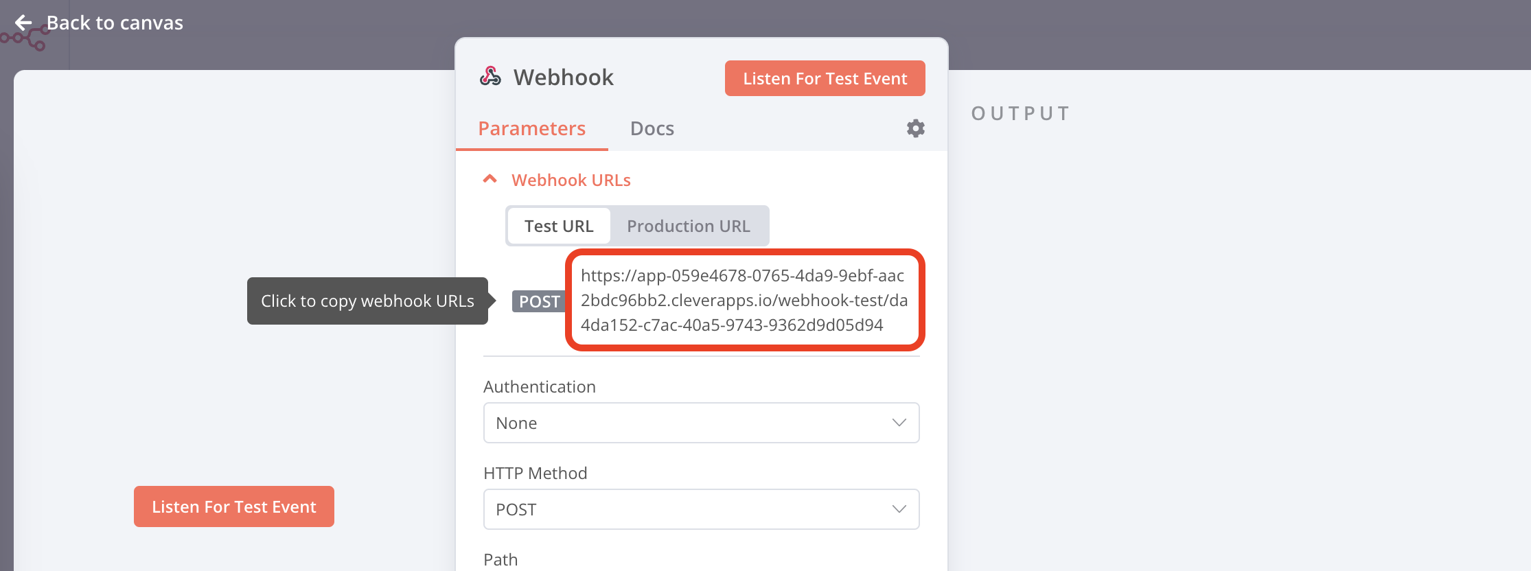 Il ne nous reste plus qu’à tester l’ensemble. Avant cela, vous aurez besoin de l’URL du webhook permettant de créer une instance. Pour obtenir l’URL, double-cliquez sur le nœud webhook et copiez l’URL :