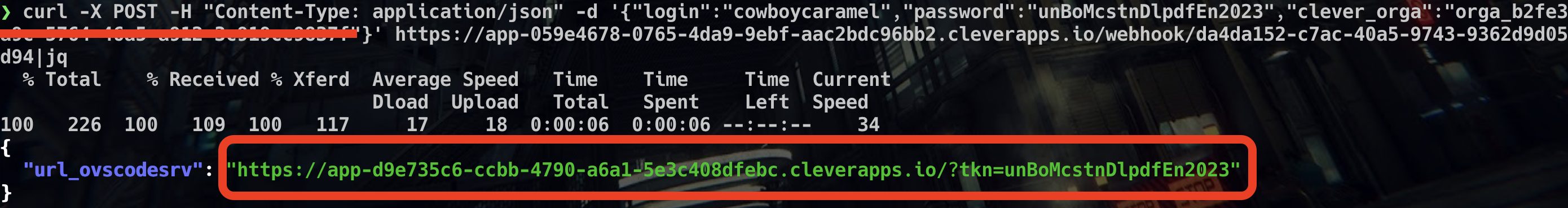 | curl -X POST -H "Content-Type: application/json" -d '{"login":"cowboycaramel","password":"unBoMcstnDlpdfEn2023","clever_orga":"orga_xxxxxxxx-xxxx-xxxx-xxxx-xxxxxxxxxxxx"}' https://app-059e4678-0765-4da9-9ebf-aac2bdc96bb2.cleverapps.io/webhook/da4da152-c7ac-40a5-9743-9362d9d05d94|jq